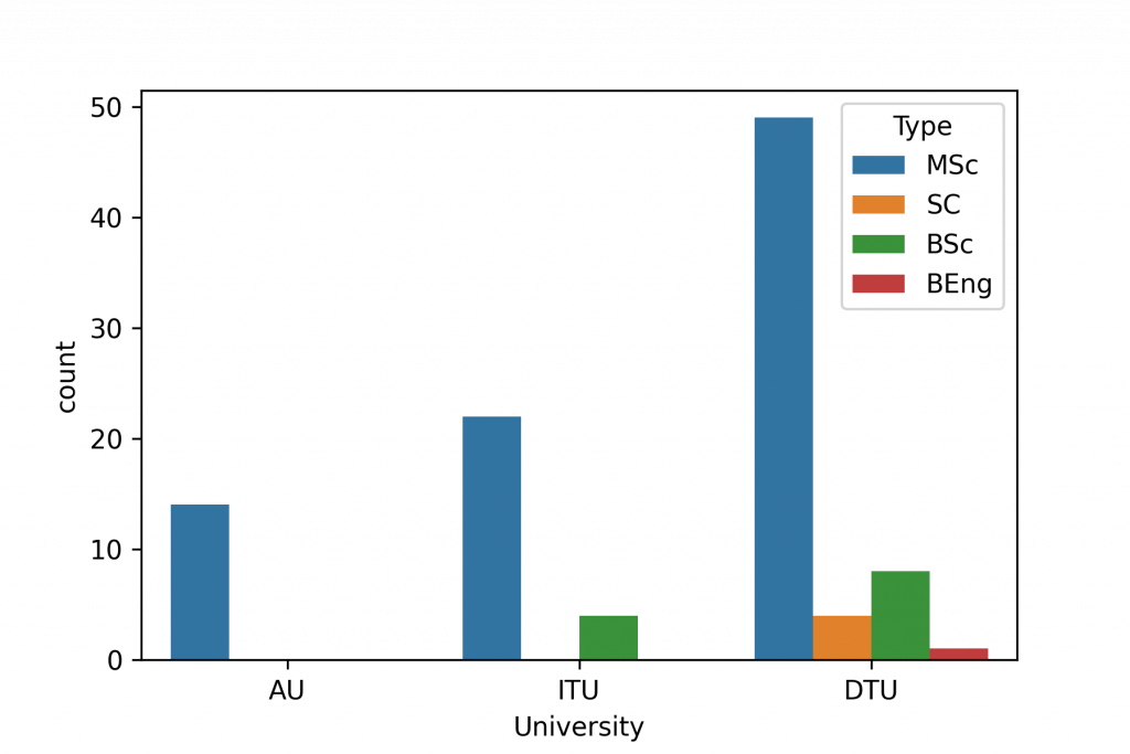 It turns out that by now I’ve been supervising 102 students in total, 14 at AU, 26 at ITU, and 62 at DTU. The plot below shows this count and also shows the type of thesis: MSc, BSc, BEng (“Diplomingeniør” in Danish), or a Special Course (SC) project. As can be seen, the majority of the projects have been MSc Theses (in Danish “Kandidatspeciale”).