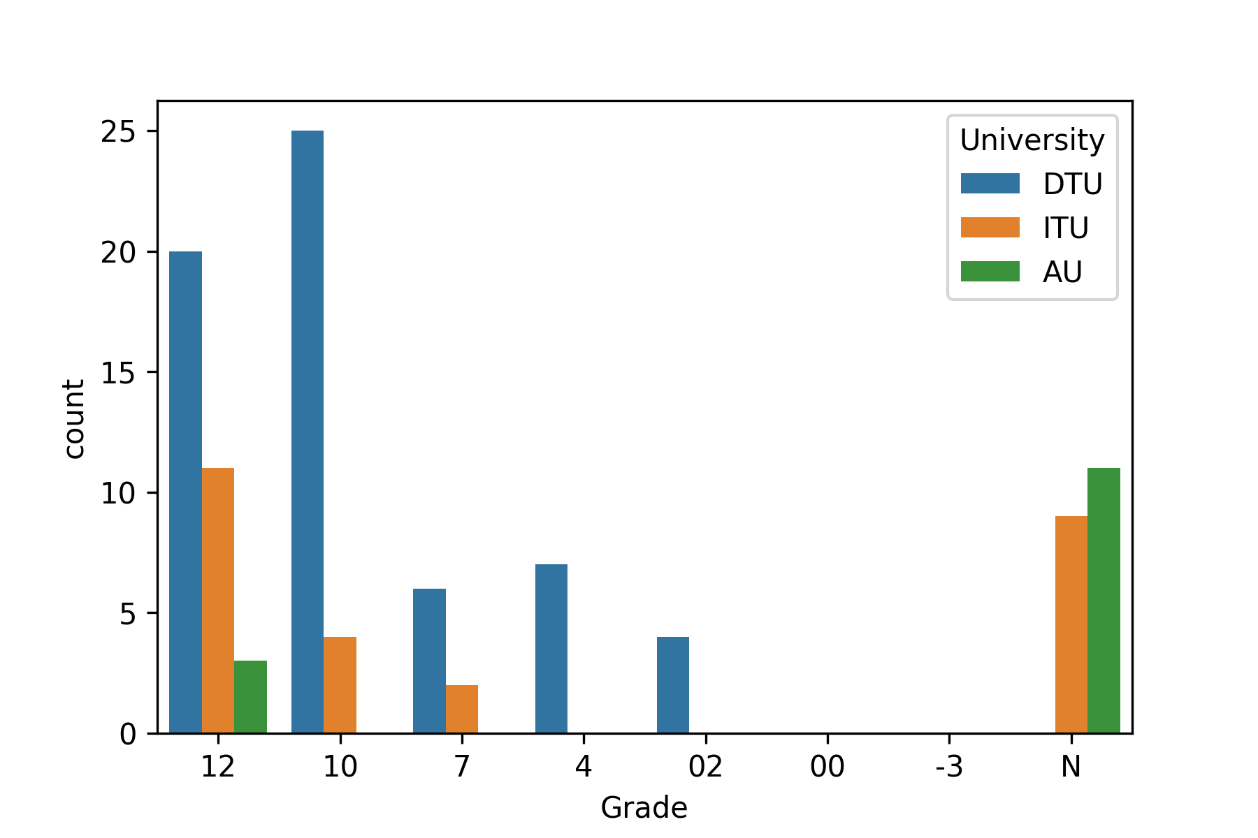 I’ve also kept track of grading, when possible (mainly at DTU and ITU). The distribution (on the Danish 7-point grading scale) is shown in the plot below. “N” is a non-available grade (or grades in the old 13-style of grading). In general, it’s good to see that my student seems to be doing well (grades 10 or 12).